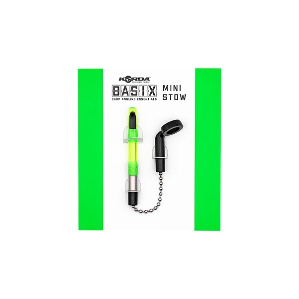 Jest to mniejsza wersja słynnych hangerów Stow, które zostały opracowane na brzegach jeziora Elstow i od lat są używane przez wielu członków Team’u Korda. Zasadą działania tego hangera jest to, że można nim łowić zarówno z napiętej, jak i luźnej lince, a po podjęciu linka uwalnia się z klipsa z boku. Aby tak się stało, łańcuszek kulkowy ze stali nierdzewnej, do którego jest dopasowany, musi mieć taką samą długość jak sygnalizator brań, a system odłączanych łączników pozwala łatwo go dostosować, aby był kompatybilny z każdym sygnalizatorem (jest ustawiony na odpowiednią długość do użycia z czymś takim jak Delkim lub podobnym alarmem). Jest wyposażony w obciążnik ze stali nierdzewnej, ale można z nim również używać obciążników 6g i 8g, które są sprzedawane osobno jako część gamy Stow. Basix Mini Stow może być wyposażony w Mini Isotope (dostępny w siedmiu różnych kolorach) i jest montowany pod sygnalizatorem brań za pomocą odlewanego kija hokejowego, do którego wkręca się łańcuszek kulkowy. Dostępny w kolorze czerwonym, zielonym lub niebieskim.