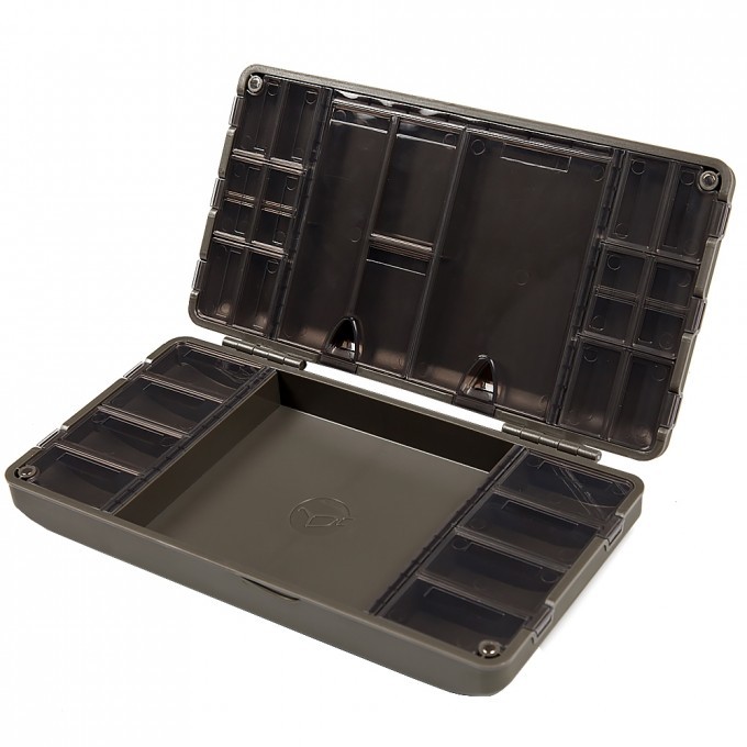 Ta sama połowa TackleSafe ma również osiem przegródek, do których można uzyskać dostęp przez odchylane górne pokrywy, aby upewnić się, że zawarte w nich przedmioty nie mogą przypadkowo się wysypać – jest idealny do rzeczy takich jak koraliki Heli-Safe, hybrydowe klipsy i fałszywe jedzenie , na przykład. Z drugiej strony TackleSafe znajdują się dwie większe przegrody z pokrywkami, w których można przechowywać pakiety haczyków, igieł do nęcenia. Posiada również kilka mniejszych, zamykanych, płytszych przegródek, które można wykorzystać do przechowywania krętlików, przyponów, rurki termokurczliwej, kopniaków i innych mniejszych elementów wyposażenia końcowego