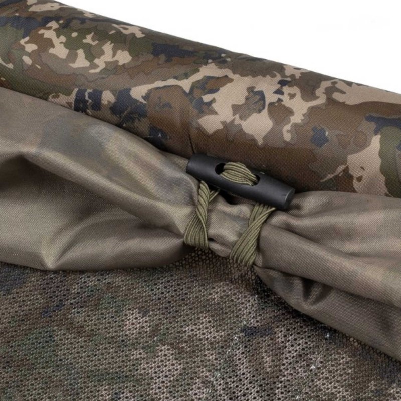 Dla zwiększenia bezpieczeństwa podczas przetrzymywania karpia, mata wyposażona została w osłonę zabezpieczającą rybę w czasie jej gwałtownych ruchów. Całość wykończono w efektownym wzorze kamuflażu Nash CAMO, który świetnie komponuje się z naturalnym otoczeniem.